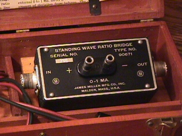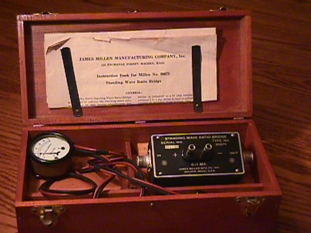 and 75 ohm antenna systems. I bought the above from an estate auction and it came with the nice wood cabinet shown in the pictures. I'm not sure if this was a Millen option or not. If it wasn't someone sure did a wonderful job building a case just for this bridge. Millen did not supply the actual 0-1 Ma meter. I'm not sure why they didn't, because there are many products made by Millen that have Millen logos on the meters. Owner: Don Buska, N9OO |